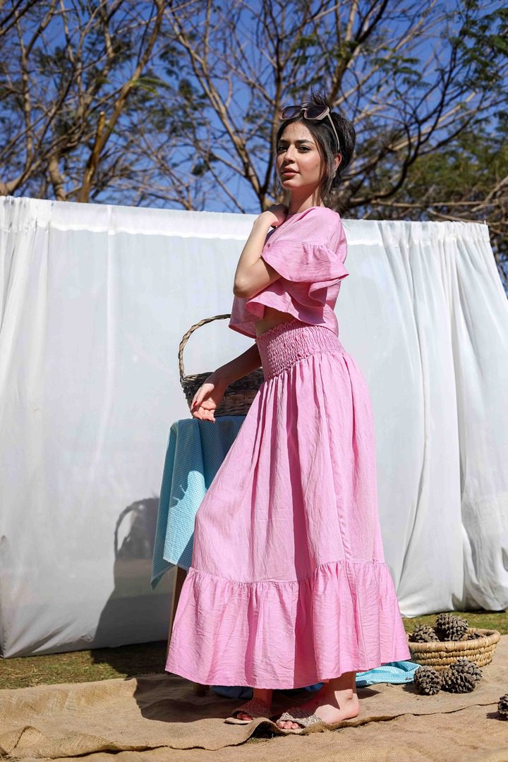 Light, feminine, and effortlessly flowing — this pink tiered skirt is made to move with you. With its soft texture and flattering elastic waist, it creates a relaxed silhouette that feels both playful and refined, perfect for warm days and soft moments.