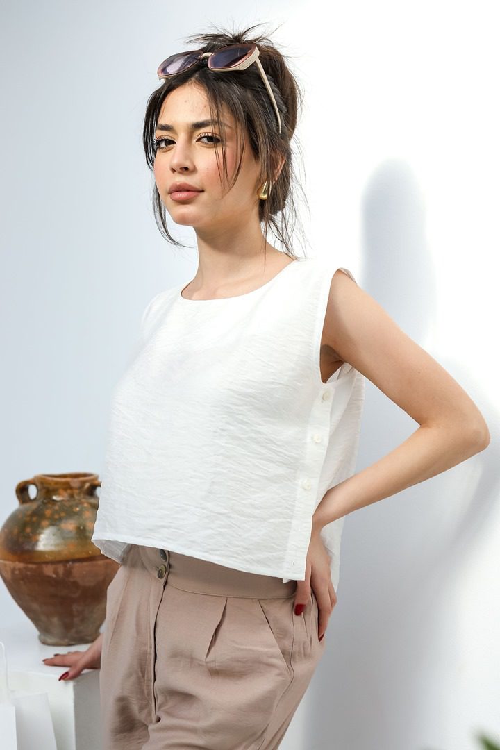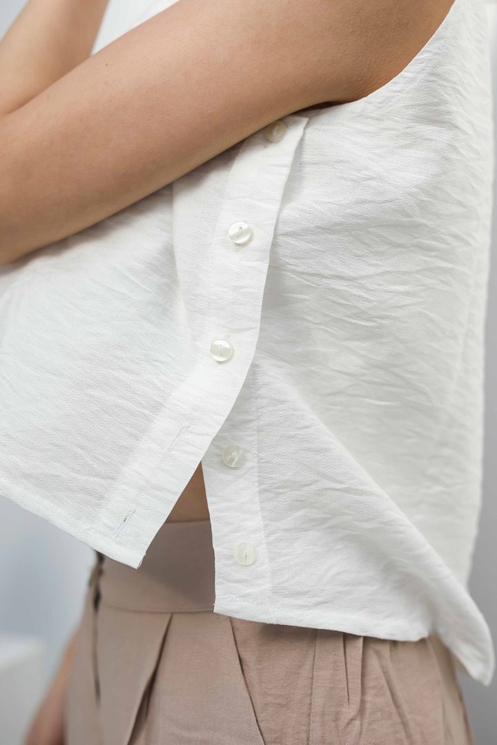 A modern essential for warm-weather dressing, this top is crafted from premium Spanish linen in a crisp ivory tone. The design features a side-buttoned cut that adds a subtle architectural element to the silhouette, creating a balance between structure and ease. Lightweight and breathable, the fabric allows for natural movement while maintaining a polished look. Minimal yet distinctive, this piece is perfect for elevating everyday outfits with a clean, contemporary edge.